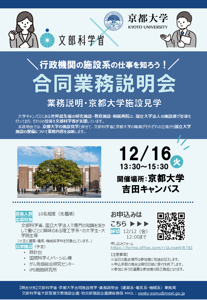 本説明会では、京都大学の施設見学と併せて、大学施設の整備について、文部科学省と京都大学の現役職員がそれぞれの立場から業務内容の説明・ 質疑応答します!